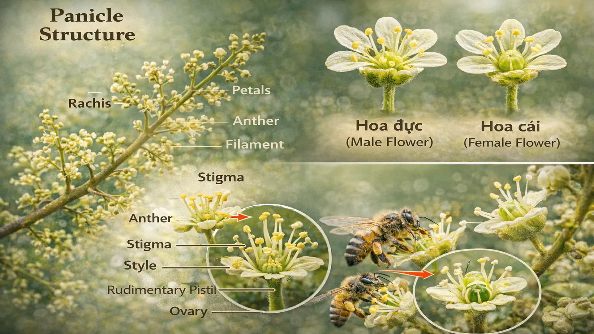 Cấu trúc quyết định năng suất, hoa nhãn mọc thành chùm xim lớn (panicle). Trên một chùm hoa có thể xuất hiện: